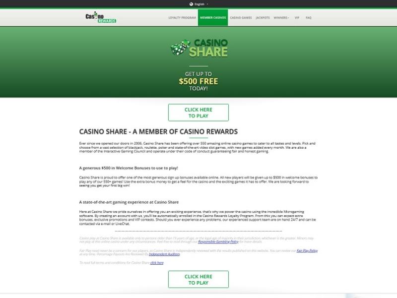 多年来,Casino Share 一直为全球玩家提供游戏,并以其卓越的客服支持、丰富的游戏库和丰厚的奖金而闻名,成为一个备受推崇的品牌。该赌场于 2011 年被 Casino Rewards Group 收购,并继续作为优秀的在线博彩品牌运营。赌场资讯