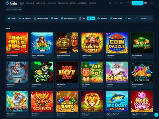 CasinoBello 的游戏库海量,提供数千款精彩刺激的赌场游戏。所有游戏均按以下类别精心分类:大厅、累积奖金游戏、新游戏、真人游戏、老虎机、轮盘、桌面游戏、购买奖励、Megaways和即时赢奖。