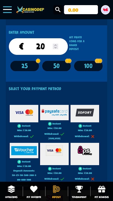 至于CasinoDep,完全不必担心缺少软件开发人员,因为他们拥有业内一些顶尖的软件开发商供您选择。其中一些最受欢迎的软件开发商包括BGaming、Betsoft、 Yggdrasil 、Leander、Habanero、Green Jade Games、Edict等等。