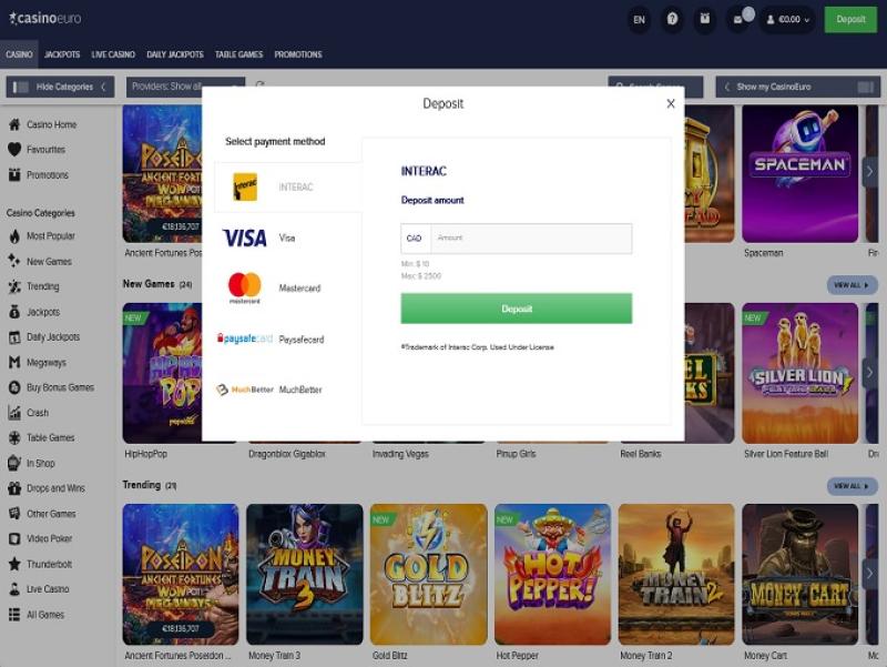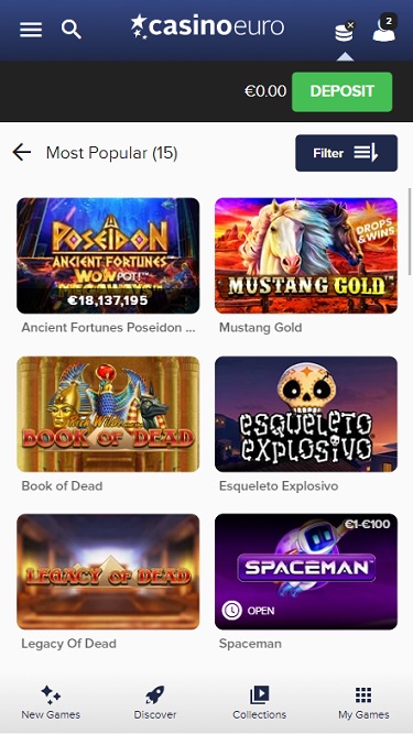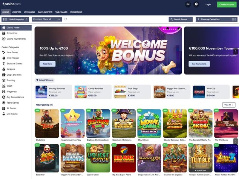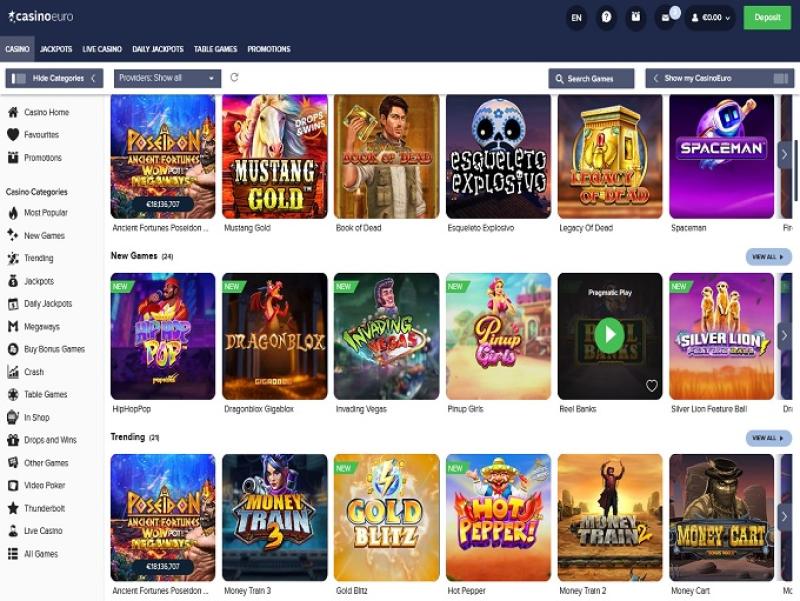 CasinoEuro 由 Amaya, Microgaming, Net Entertainment, Playtech, BetSoft, 1x2gaming, Barcrest, Big Time Gaming, ELK Studios, Evolution Gaming, EYECON, Habanero Systems, iSoftBet, lightningboxgames, Novomatic, Oryx, Play'n GO, playson, Quickspin, Relax Gaming, Saucify, Thunderkick, Yggdrasil, Endorphina, Wazdan, Realistic Games, Booming Games, Stakelogic, Pragmatic Play, Nolimit City, Red Tiger Gaming, IGT, Spinomenal, Red Rake Gaming, Skillzzgaming, Fantasma Games, SYNOT Games, Kalamba, Revolver Gaming, Sigma Gaming, Skywind, Triple Edge Studios, BGAMING, Northern Lights Gaming, Evoplay, Stormcraft Studios, Switch Studios, Electric Elephant Games, Pocket Games Soft, Bulletproof Games, All41 Studios, Gluck Games, Gameburger Studios, Pulse 8 Studios, Neon Valley Studios, Golden Rock Studios, Swintt, Shuffle Master, SpinPlay Games, HungryBear Gaming, SmartSoft Gaming, Real Dealer Studios, GONG Gaming, Blue Guru Games, Buck Stakes Entertainment, Design Works Gaming, Elysium Studios, Games Global, Reevo, Amusnet Interactive, 2by2 Gaming, Ash Gaming, Bally Technologies, bluberi, Blueprint Gaming, Greentube, Leander Games, NeoGames, Pariplay, Push Gaming, Tom Horn Gaming, WMS, Inspired Gaming, Gaming Realms, Genii, SG Interactive, Gamomat, Red7Mobile, CORE Gaming, Scientific Games, RFranco Group, Side City Studios, Reel Time Gaming, Bally Wulff, Iron Dog Studio, Old Skool Studios, Foxium, Betdigital, Zitro, Just For The Win, The Games Company, Reflex Gaming, PearFiction Studios, Apollo Games, Wild Streak Gaming, Slingshot Studios, Fortune Factory Studios, 4ThePlayer, AvatarUX, Gamevy, Crazy Tooth Studio, NetGaming, ReelPlay, Japan Technicals Games, Alchemy Gaming, Rarestone Gaming, Black Pudding Games, Snowborn Games, Boomerang Studios, Hacksaw Gaming, Max Win Gaming, Gold Coin Studios, Bang Bang Games, Half Pixel Studios, Slotmill, Peter And Sons, Eurostar Studios, Aurum Signature Studios, Lucksome Gaming, Area Vegas, RAW iGaming, ELA Games, Leap Gaming, Aviatrix, Wishbone Games, Apparat Gaming, Spribe, Circular Arrow, Print Studios, HammerTime Games, Four Leaf Gaming, INO Games, Nailed It! Games, Atomic Slot Lab, Reel Kingdom, Indigo Magic, Light & Wonder, Kitsune Studios and Sneaky Slots提供支持,为玩家提供丰富的游戏选择。该赌场仅通过网页平台运营,玩家无需下载任何软件即可直接在浏览器中畅玩。