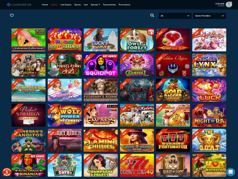 CasinoInter 的游戏类别包括赌场、真人娱乐场、体育博彩、真人游戏和特色游戏。虽然该运营商在体育博彩领域拥有令人印象深刻的业绩,但这并非我们的重点。我们一如既往地对在线赌场游戏感兴趣。