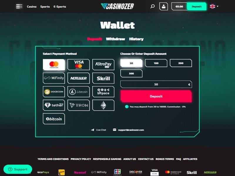 - Casinozer 有权根据玩家选择的付款方式确定最高和最低存款金额,并以不同于玩家指定的付款方式转账。