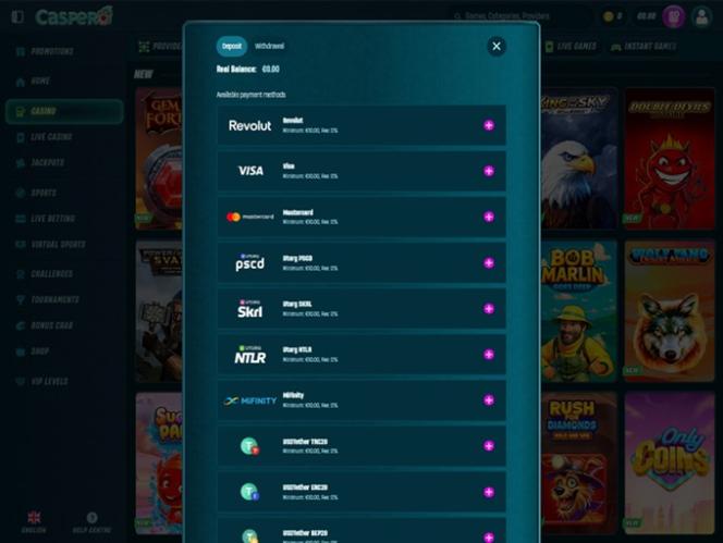 Caspero Casino 为用户提供多种存款和取款方式。其中包括Visa 、 Mastercard 、银行电汇、 Skrill 、 Neteller 、 Paysafecard 、 Revolut等传统支付方式。此外,还提供比特币、比特币现金、卡尔达诺、狗狗币、以太坊、莱特币、 USD Coin 、泰达币和瑞波币等现代加密货币选项。