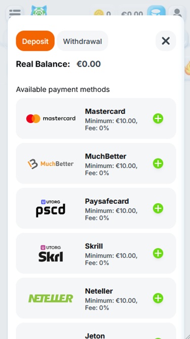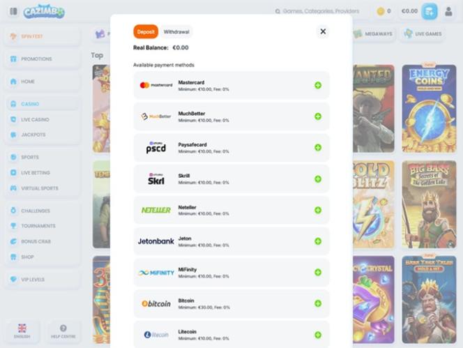 Cazimbo 涵盖所有类型的赌场支付解决方案,包括比特币和其他加密货币支付选项。此外,还提供其他流行的存款和取款方式,例如支付卡、电子钱包、银行转账等。