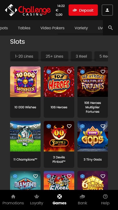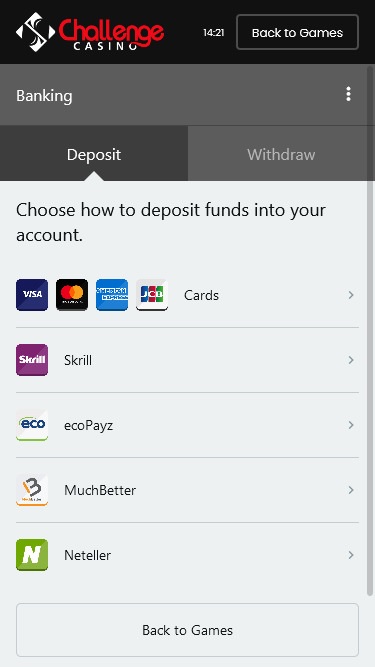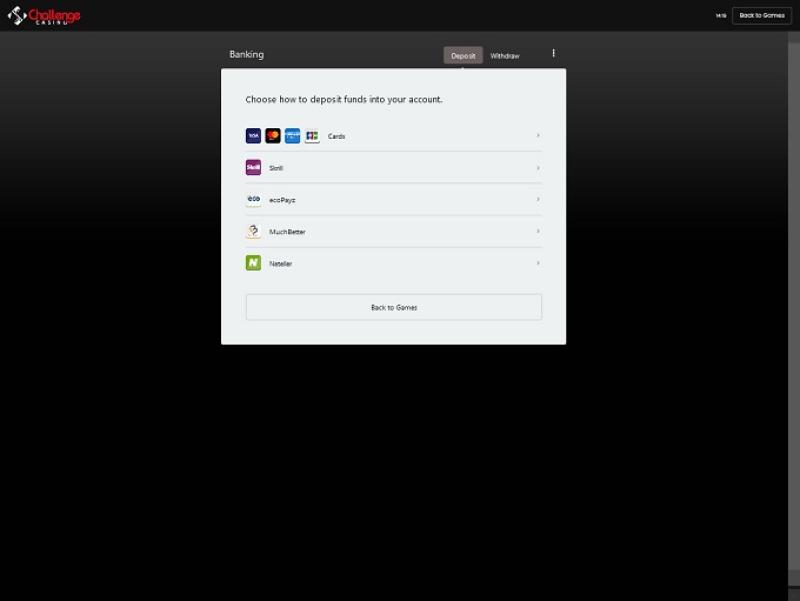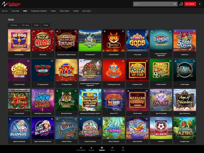 Challenge Casino 由 Microgaming, Evolution Gaming, Rabcat, Triple Edge Studios, Northern Lights Gaming, Stormcraft Studios, Switch Studios, Electric Elephant Games, All41 Studios, Gameburger Studios, Pulse 8 Studios, Neon Valley Studios, SpinPlay Games, Real Dealer Studios, GONG Gaming, Buck Stakes Entertainment, Games Global, Old Skool Studios, Foxium, Just For The Win, PearFiction Studios, Slingshot Studios, Fortune Factory Studios, Crazy Tooth Studio, Alchemy Gaming, Snowborn Games, Gold Coin Studios, Half Pixel Studios, Eurostar Studios and Aurum Signature Studios提供支持,为运营商提供了数百款游戏库。赌场通过基于 Flash 的平台提供这些游戏,您可以在浏览器中畅玩,同时还为喜欢直接在电脑上玩游戏的玩家提供可下载的版本。Baccarat
