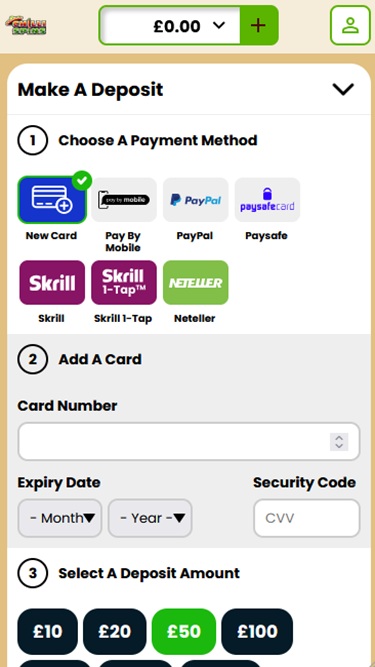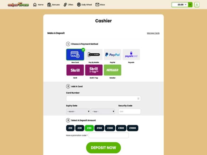 玩家可以使用多种银行选项在其账户中存入和提取资金,包括Visa 、 Mastercard 、 Maestro 、 Skrill 、 Neteller 、 Paysafecard和PayPal 。如果您一直在寻找接受加密货币的在线赌场,那么您会失望,因为 Chilli Spins 不接受任何加密货币。