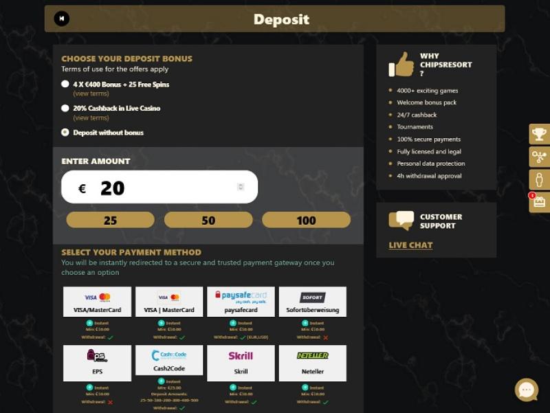 为了确保赌徒的敏感数据和现场支付的安全,ChipsResort 使用了 SSL 加密,这是 iGaming 行业安全标准。