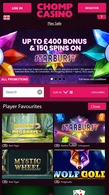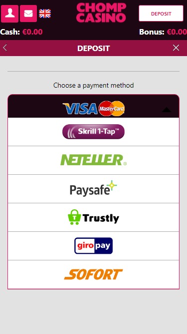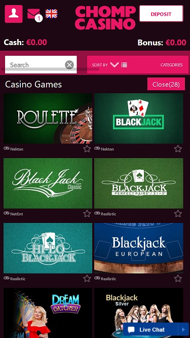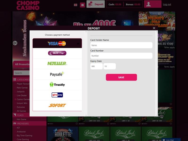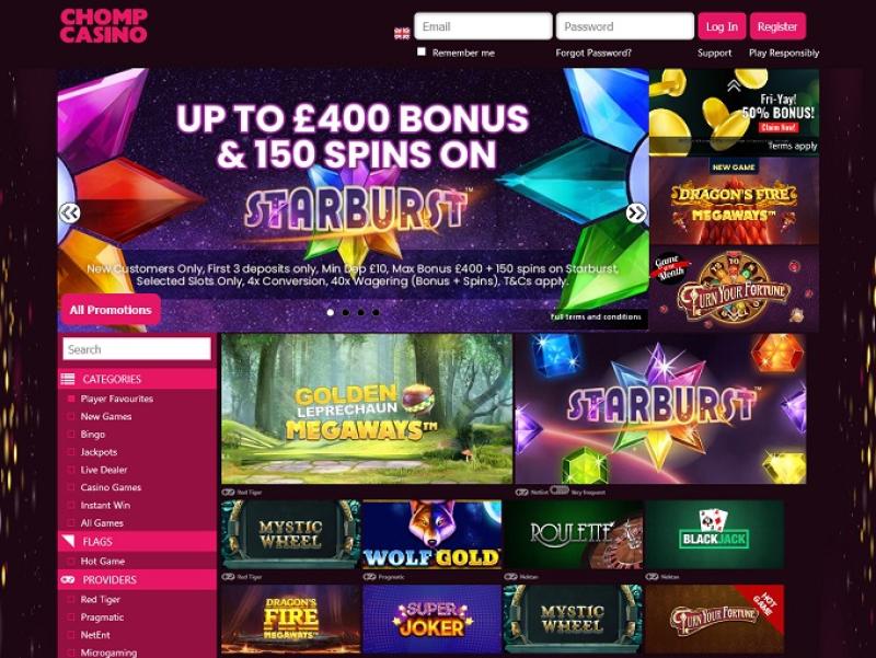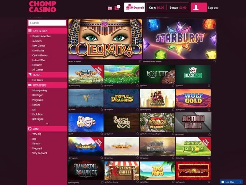 Chomp Casino 由 Microgaming, Net Entertainment, Big Time Gaming, ELK Studios, EYECON, lightningboxgames, Realistic Games, Pragmatic Play, Red Tiger Gaming, Skillzzgaming, Golden Rock Studios, SpinPlay Games, Games Global, Blueprint Gaming, Merkur Gaming, Nektan, NextGen, NYX Interactive, Inspired Gaming, Scientific Games, Iron Dog Studio, Foxium, The Games Company, Rocksalt Interactive, 4ThePlayer, Crazy Tooth Studio and ReelFeel Gaming提供支持,其游戏均通过基于网络的平台提供,这意味着您可以通过互联网浏览器访问其游戏。