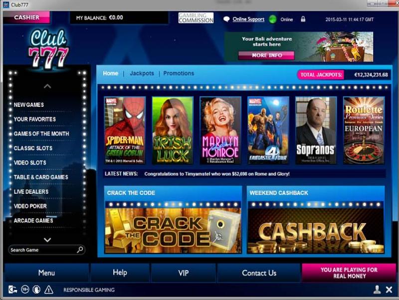 老虎机是Club777赌场游戏库中最大的组成部分,现代老虎机与经典的3轴老虎机并存。赌场的老虎机游戏包括《洛奇》、《X战警》、《粉红豹》、《金刚》等众多热门游戏。Club777还提供多个大型累积奖金,包括“海滩人生”、“圣杯巨蟒”和“甜蜜派对”累积奖金,以及十多个其他即时赢取的奖项。