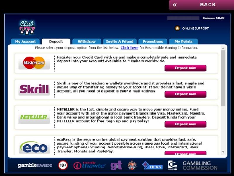 Playtech提供支持,提供海量游戏库和易于使用的赌场平台。想要在 Club777 下注的玩家可以通过下载的软件或与下载客户端完全相同的网页平台进行投注。此外,还提供移动赌场,方便玩家通过智能手机和平板电脑进行游戏。
