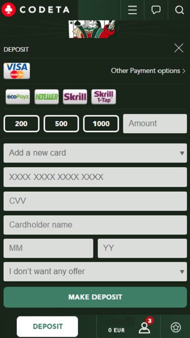 Codeta 的银行系统非常完善,赌场支持通过 Visa、Neteller、Skrill、Moneybookers、Euteller 和 MasterCard 进行存款和取款。此外,还可以通过 Paysafecard 存款,并通过 Trustly 和银行电汇提款。提供的电子钱包可即时到账,其他交易类型则需要更长时间。这家赌场没有提现限制。