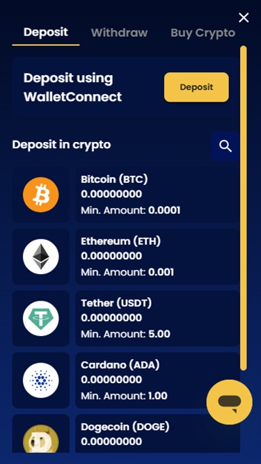 这是一个仅接受加密货币的博彩平台,这意味着玩家无法使用传统的银行方式进行存款和取款。支持的加密货币包括比特币、 卡尔达诺、 狗狗币、 以太坊、 莱特币、 泰达币、波场币和美元币。