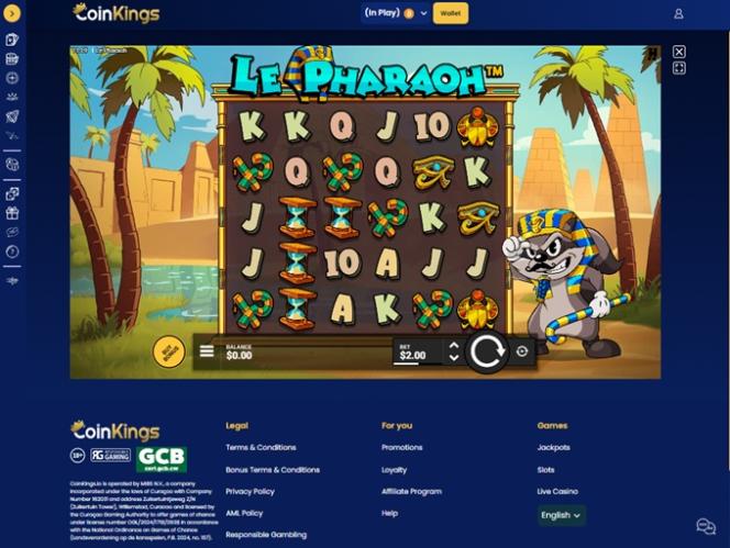 在主页底部,用户可以导航到 CoinKings 品牌的关键部分,例如服务条款、负责任博彩、隐私政策和奖励条件。值得一提的是,玩家还可以在这里切换网站显示的语言。