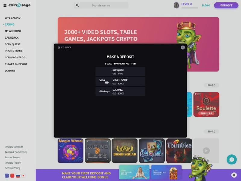 CoinSaga 赌场是一家接受加密货币的在线赌场,接受比特币。提款免费,款项将通过初始存款方式支付到您的账户。如果初始存款方式不可用,提款将通过您之前使用的其他付款方式支付。如果提款金额超过 1,000 美元,公司可能会要求您提供KYC 流程所需的文件。