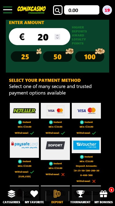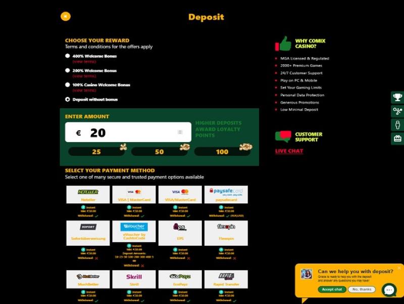 ComixCasino 提供多种可靠的银行支付方式,例如支付卡、电子钱包、电汇以及在特定地区(拉丁美洲、印度等)流行的多种支付系统。遗憾的是,我们访问该网站时,尚未提供加密货币支付选项。