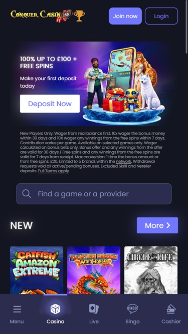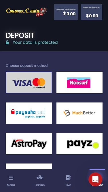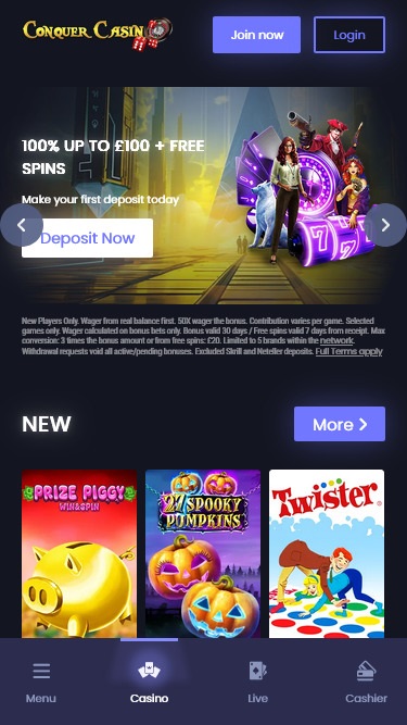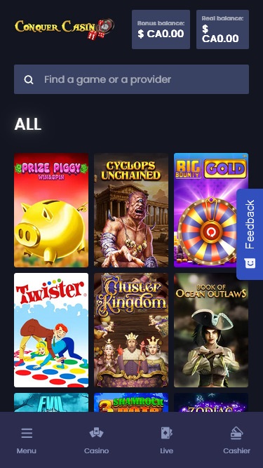 Conquer Casino 由 Microgaming, Net Entertainment, Playtech, BetSoft, 1x2gaming, Barcrest, Big Time Gaming, ELK Studios, Evolution Gaming, EYECON, Genesis Gaming, Habanero Systems, lightningboxgames, Play'n GO, playson, Quickspin, Rabcat, Rival, Thunderkick, Vivo Gaming, Wazdan, Booming Games, BetConstruct, Pragmatic Play, Nolimit City, IGT, LuckyStreak, Spinomenal, Skillzzgaming, Fugaso, Fantasma Games, Kalamba, Revolver Gaming, Skywind, Triple Edge Studios, Evoplay, Stormcraft Studios, Switch Studios, All41 Studios, TVBet, Gameburger Studios, Pulse 8 Studios, Neon Valley Studios, Super Spade Games, Shuffle Master, SpinPlay Games, Games Global, 2by2 Gaming, Blueprint Gaming, Games Warehouse, Leander Games, NextGen, NYX Interactive, ProgressPlay, Tom Horn Gaming, WMS, Inspired Gaming, Genii, Red7Mobile, CORE Gaming, Scientific Games, Iron Dog Studio, Foxium, Betdigital, Just For The Win, PearFiction Studios, Slingshot Studios, Fortune Factory Studios, Gamevy, Crazy Tooth Studio, ReelPlay, Alchemy Gaming, SimplePlay, Gold Coin Studios and Half Pixel Studios提供支持,其赌场游戏通过网页平台提供。玩家还可以访问移动网站,使用智能手机和平板电脑即可畅玩。