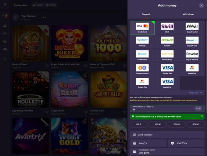 喜欢在线赌场提供丰富博彩活动的玩家一定会在 Coolzino 赌场度过一段美好的时光。该品牌提供在线老虎机、桌面游戏、真人娱乐场游戏和刮刮卡。这些游戏种类繁多,我们相信即使是最经验丰富的玩家也能轻松找到从未玩过的游戏。