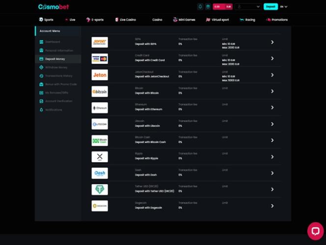 最后,我们不得不提的是,Cosmobet 赌场还提供众多投注系统。体育博彩通常是最受欢迎的游戏平台之一,在这里,玩家可以投注众多热门体育赛事和电子竞技,甚至还可以投注现场比赛。此外,它还提供虚拟体育和赛马投注,这使得它成为一个非常强大的投注平台。