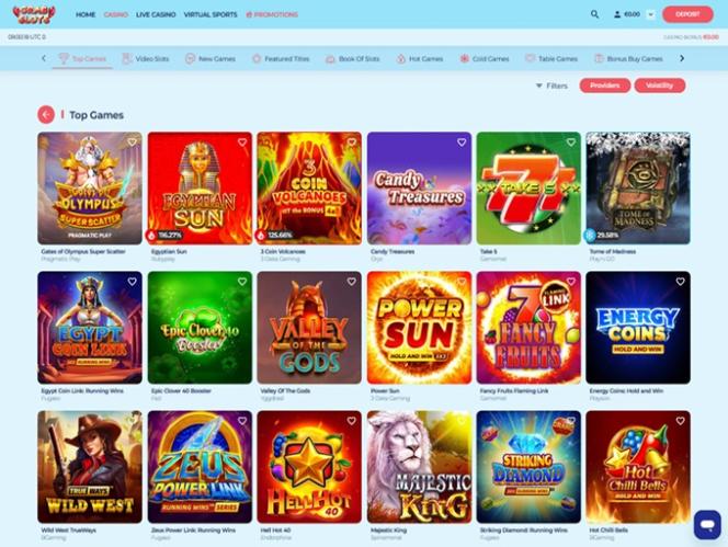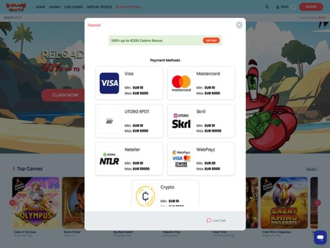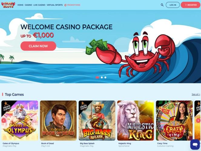 加载网站后,映入眼帘的是令人赏心悦目的浅蓝色主题,当然还有一只螃蟹。页面左上角是主页、赌场、真人娱乐场、虚拟体育和促销菜单。在页面的另一侧——页面右侧,您可以找到您的账户余额和存款菜单,如果您尚未登录,则可以看到登录/注册按钮。
