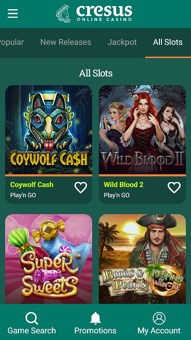 Cresus Casino 由 Net Entertainment, BetSoft, Evolution Gaming, iSoftBet, Oryx, Play'n GO, playson, Quickspin, Relax Gaming, Yggdrasil, Pragmatic Play, Nolimit City, Red Tiger Gaming, Booongo, Kalamba, Push Gaming and Gamomat提供支持,其赌场游戏通过网页平台提供。此外,我们还提供移动网站,方便用户在智能手机和平板电脑上畅玩。
