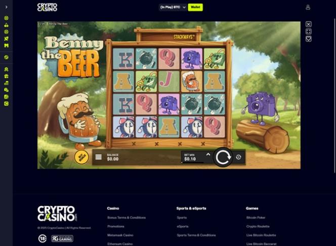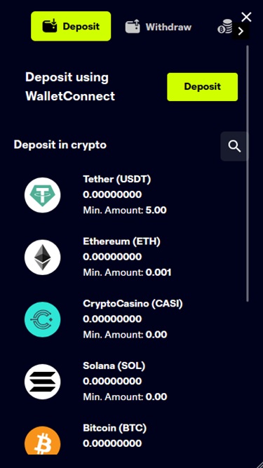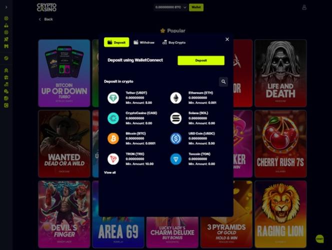 正如品牌名称所示,CryptoCasino 是一个以加密货币为导向的博彩网站,允许玩家使用多种加密货币作为主要的存款和取款方式。部分可用货币包括比特币、 比特币现金、 卡尔达诺、 狗狗币、 以太坊、 莱特币、 Solana 、 泰达币、 波场币、 瑞波币、 USD Coin和Toncoin 。