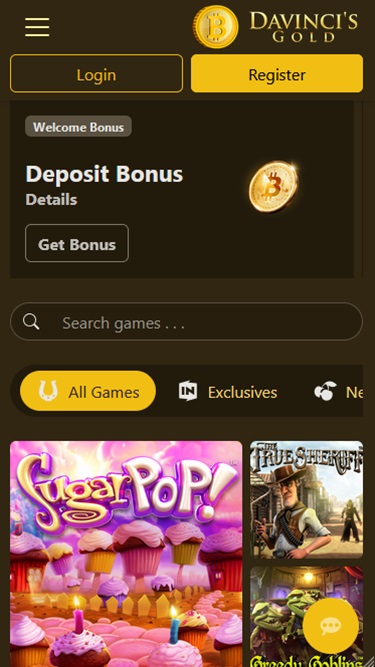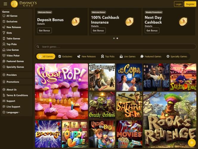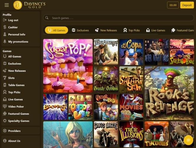 DaVinci's Gold Casino 由 BetSoft, Genesis Gaming, Rival, Saucify, Spinomenal, Radi8 Games, Fresh Deck Studios, Woohoo Games, Qora Games, Genii, Wager Gaming, Dragon Gaming and Dragoon Soft提供支持,提供全套赌场游戏,可通过可下载的软件以及基于网络的平台访问,让您直接通过网络浏览器进行游戏。Slot machines