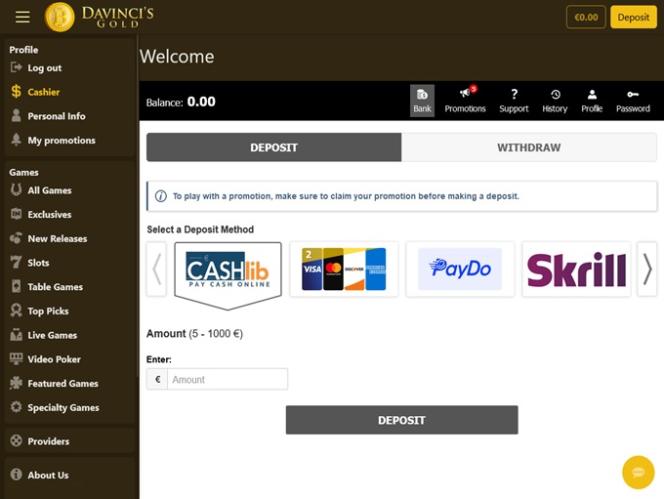 Banking银⾏业务选项 的 DaVinci's Gold Casino