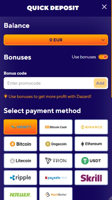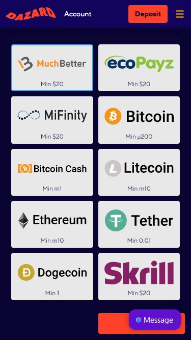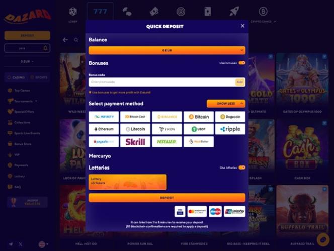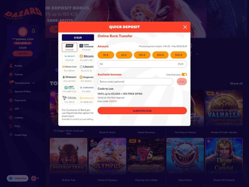 奖金清单不长,但很丰厚。Dazard 为赌场新手提供了迎新奖金,其中包括相当数量的额外旋转。
