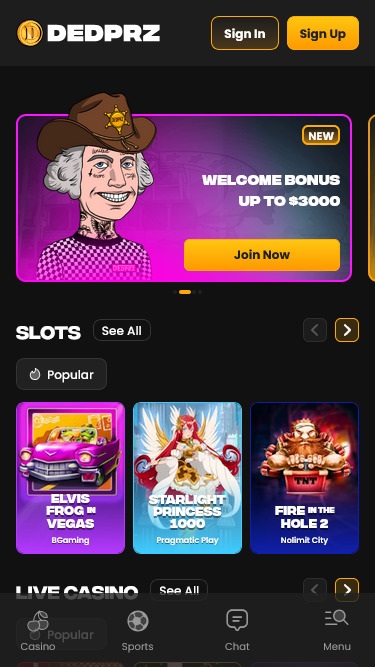 除了享受VIP计划的福利外,DEDPRZ赌场还为玩家提供小而精的促销套餐。新玩家可领取存款匹配迎新奖金,提升初始体验,现有玩家还可享受额外促销活动。