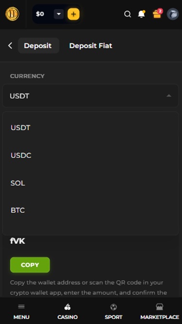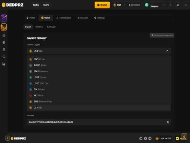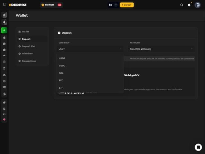 DEDPRZ 赌场是一个加密货币专属平台,仅接受加密货币作为有效的存款和取款支付方式。替代交易选项包括比特币、以太坊、 Solana 、 Tether 、 Tron和USD Coin等众多货币。遗憾的是,信用卡和电子钱包等传统银行服务暂不支持。