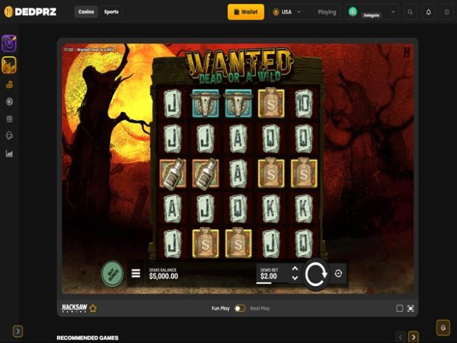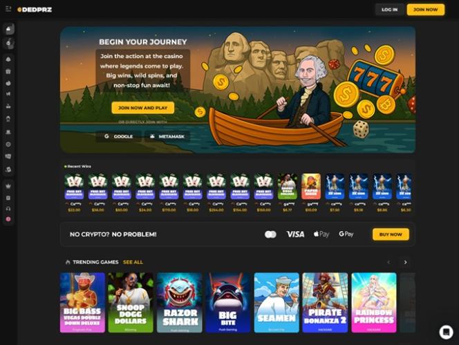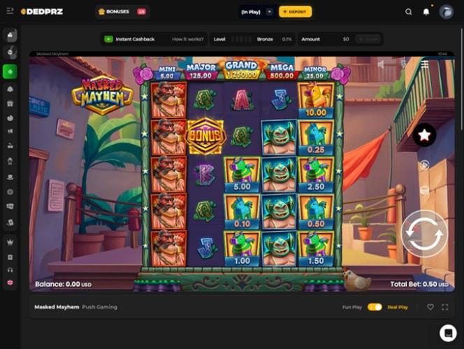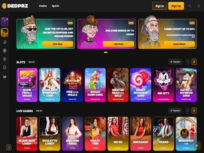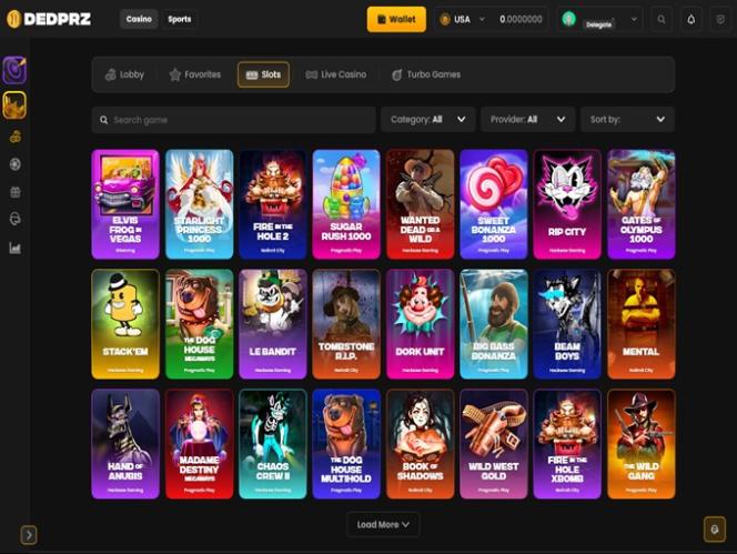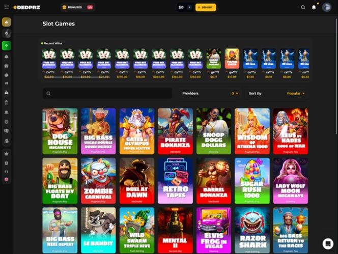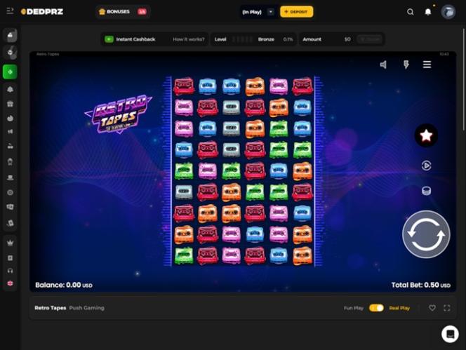 DEDPRZ 也不例外。它的平台具备极简主义赌场的所有必备元素,并且完美地切中要点,让用户轻松便捷地浏览网站。深色背景与多种霓虹色形成鲜明对比,恰如其分地突出了赌场的其他版块和页面。