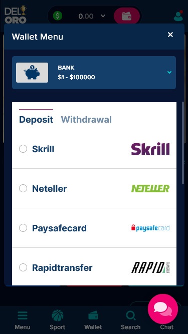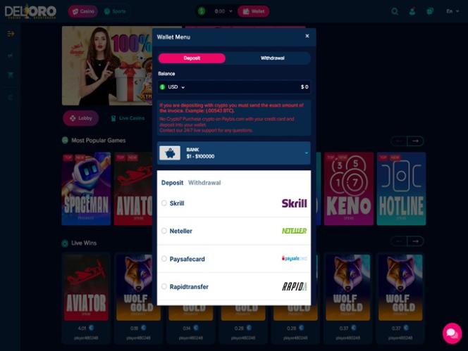 正如我们提到的,Del Oro Casino 支持多种加密货币。除了数字货币和加密钱包,玩家还可以使用传统的支付方式,包括银行电汇、借记卡和信用卡、PayPal、Skrill 以及其他流行的电子钱包和在线支付选项。