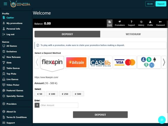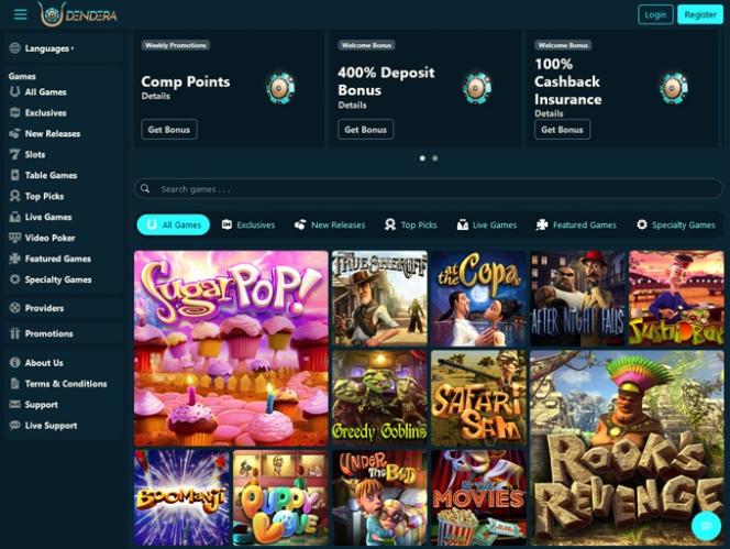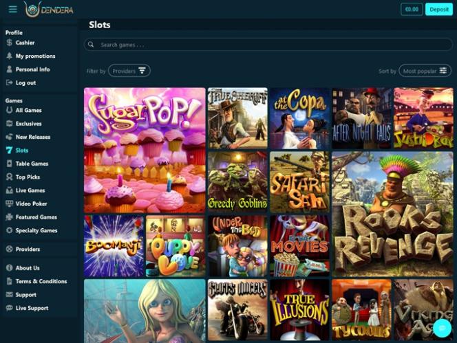 Dendera Casino 由 BetSoft, Genesis Gaming, Rival, Saucify, Vivo Gaming, Arrows Edge, Radi8 Games, Fresh Deck Studios, Woohoo Games, Qora Games, Genii, Dragon Gaming and Dragoon Soft提供支持,其游戏可通过可下载的软件以及无需下载任何软件即可玩游戏的浏览器内平台获得。
