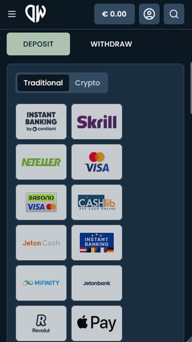 DepositWin Casino 提供多种银行服务。玩家可以选择使用 Visa、MasterCard、AstroPay、Jeton Cash、Mifinity、Cashlib 等多种支付方式存款。此外,还可以选择使用加密货币支付,因为加密货币在过去几年一直很流行。我们很喜欢这里丰富的选择。