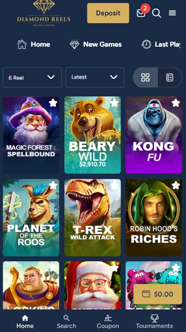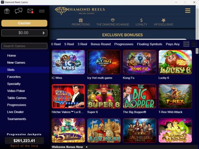 Diamond Reels 赌场提供种类繁多的老虎机游戏,但大多数都是视频老虎机。游戏风格比较标准,如果您以前在 RTG 赌场玩过,一定会认出它们。Diamond Reels 还提供累积奖金,随时都有数百万美元的奖金等着您。