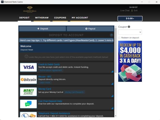 Banking银⾏业务选项 的 Diamond Reels Casino