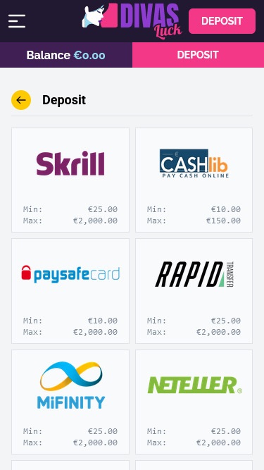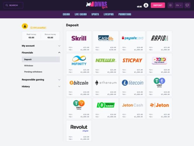 在 Divas Luck 赌场,玩家可以选择各种可靠的支付方式,例如电子钱包、银行电汇、借记卡和信用卡、 加密货币和加密钱包。请注意,可用于存款和取款的银行方式因国家/地区而异,因此请务必先确认您首选的交易方式是否适用于您所在的司法管辖区。