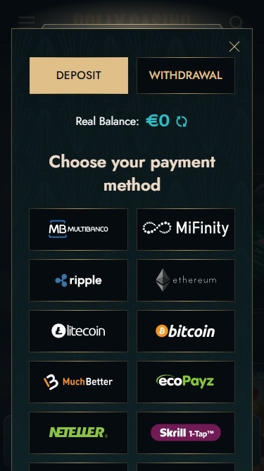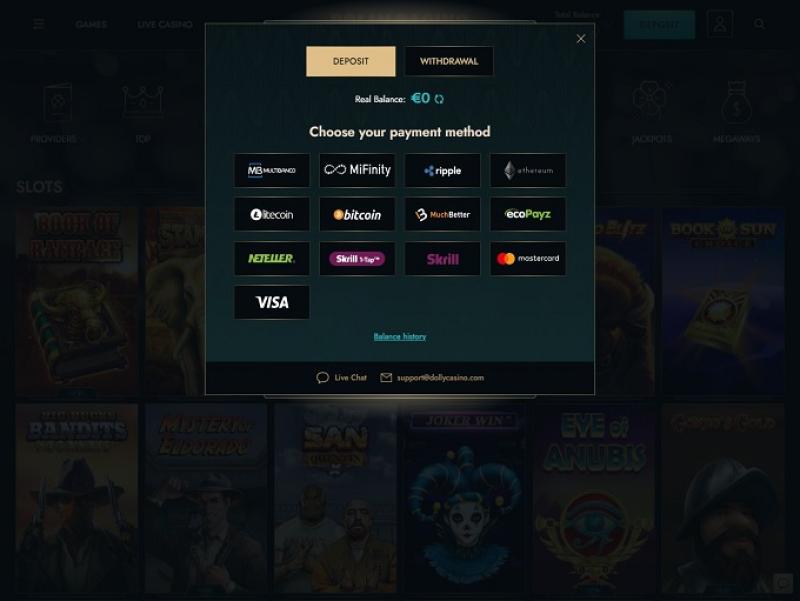 Dolly赌场提供多种银行存款和取款方式。玩家可以访问其玩家控制面板,并从其所在地区提供的众多支付选项中进行选择,包括加密货币支付选项、支付卡、电子钱包和银行转账。