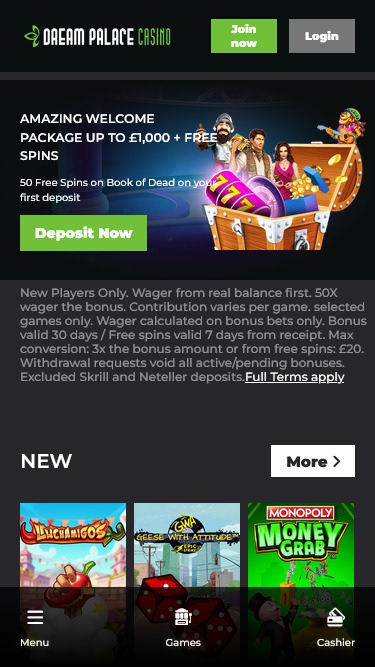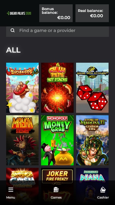 梦幻皇宫赌场 (Dream Palace Casino) 提供数百台老虎机,其中包括数十款授权游戏以及更多由开发商精心设计的独特游戏。小额累积奖金选项也让玩家有机会赢取巨额现金奖励。