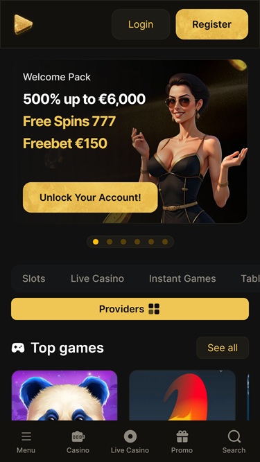 该平台采用深色主题。其细节之处彰显了优雅时尚的氛围,并包含许多精美的图形元素。用户友好的布局和赌场页脚中创意十足的主菜单只是该网站脱颖而出的几个细节,以最积极的方式为在线赌场玩家提供独特的体验。