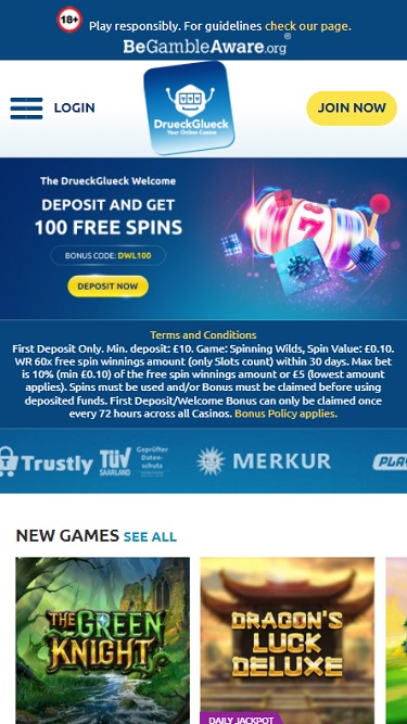 DrueckGlueck Casino 是一家服务于德国博彩市场的在线博彩网站,也是石勒苏益格-荷尔斯泰因州首批获得运营许可的网站之一。该赌场于 2015 年开业,由 Cognita Technologies Ltd 所有并运营,开业之初就拥有庞大的游戏库,为访客带来了无限希望。