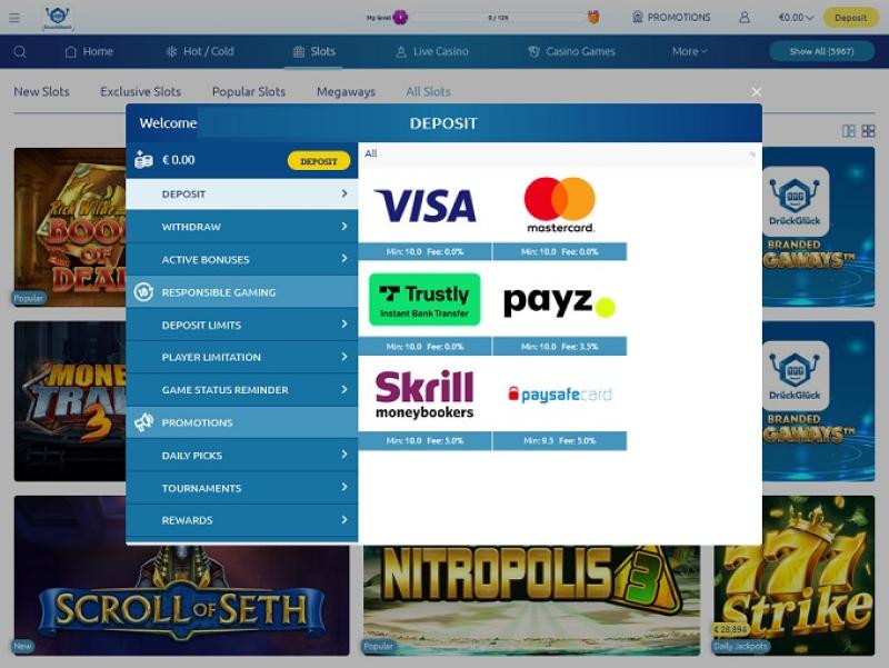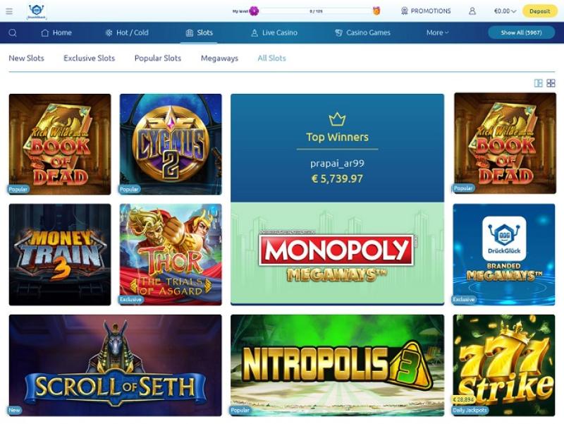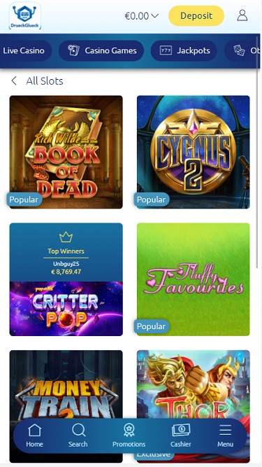 DrueckGlueck 赌场提供数百款老虎机游戏,其中大部分是视频老虎机。此外,赌场还提供移动老虎机和累积奖金,让玩家有机会在一次旋转中赢得数百万美元的奖金。