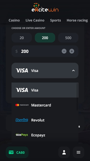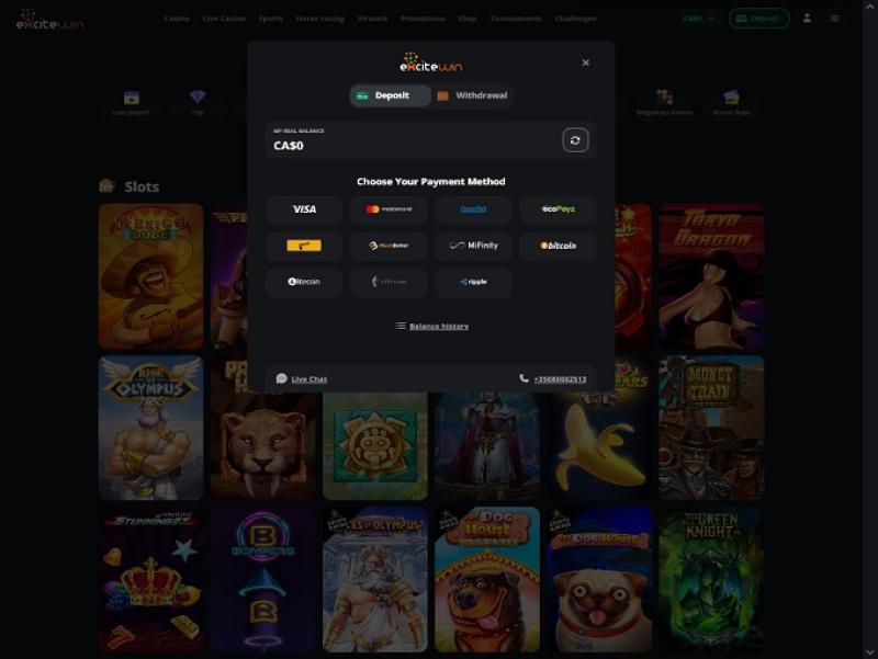ExciteWin 为其赌场会员提供了多种银行业务选项;在存款选项卡中,您可以找到几乎所有流行的支付解决方案,从传统的银行业务方式到电子钱包和加密货币。