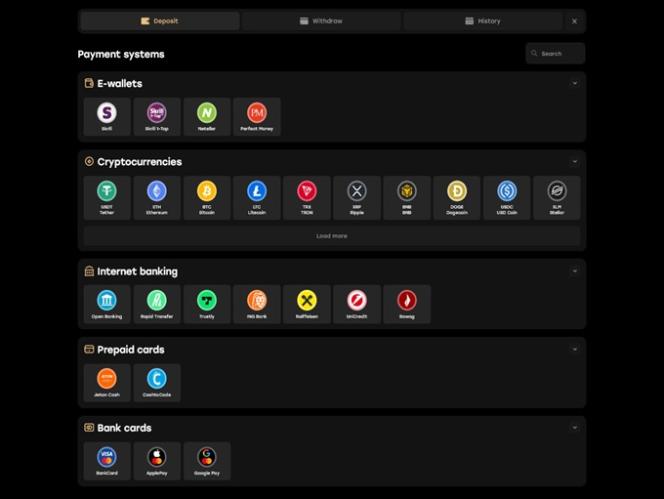 这是一个游戏网站,正如我们已经提到的,它提供各种加密货币支付选项用于存款和取款,还提供其他值得信赖和流行的银行方式,如支付卡和电子钱包。