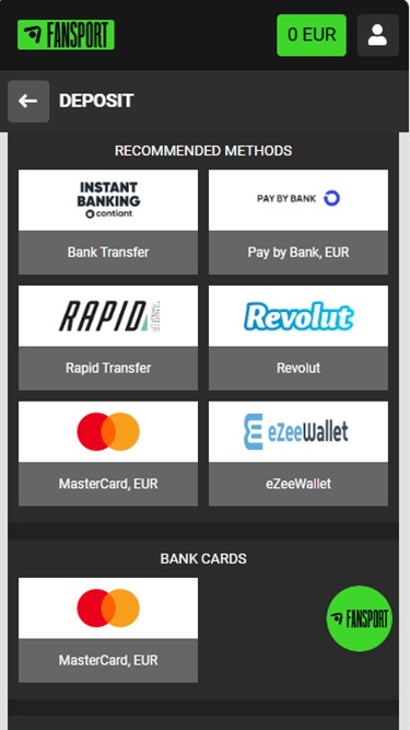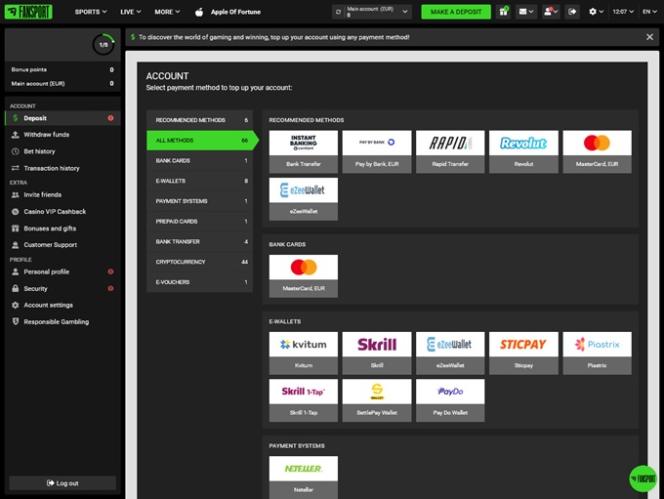 Fansport Casino 的一大优势在于,运营商为玩家提供多种传统和现代银行服务,方便他们管理资金。传统银行服务包括Visa 、万事达卡、银行电汇、 Skrill 、 Neteller 、 Jeton 、 Neosurf等。而现代银行服务则包括比特币、比特币现金、卡尔达诺、达世币、狗狗币、波卡、 EOS 、以太坊、莱特币、 ZCash 、门罗币和Toncoin等加密货币。
