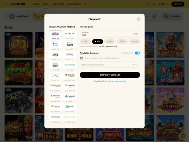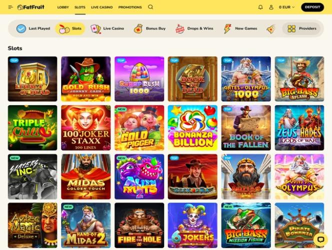 首先,FatFruit 赌场丰富的游戏库定会令玩家欣喜不已,因为游戏选项极其丰富。无论您是真钱老虎机、真人荷官游戏还是在线桌面游戏的爱好者,都能在这里找到海量的游戏选择,即使您花费数千小时也无法玩遍所有游戏内容。