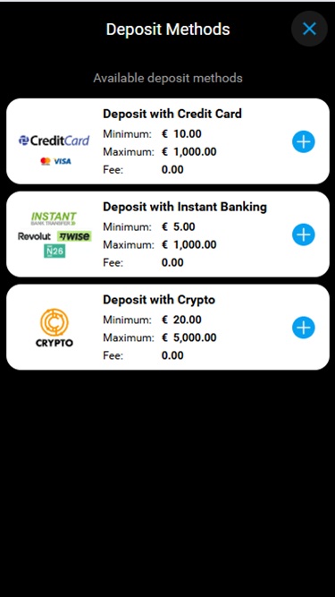 €5 (Instant Banking)/€10 (Credit Cards)/€20 (Crypto)