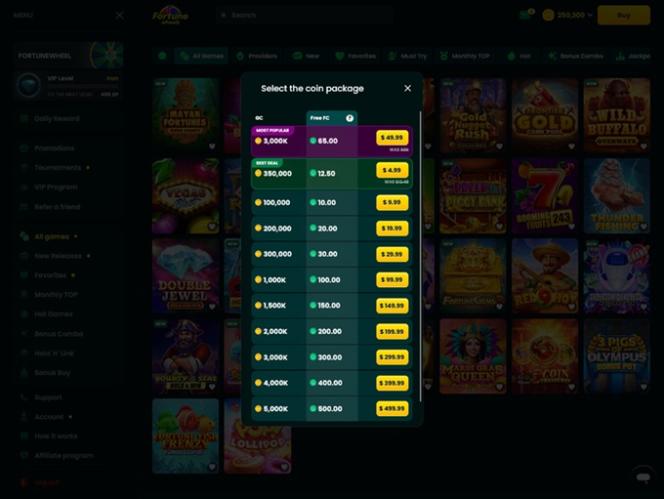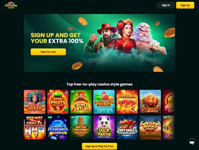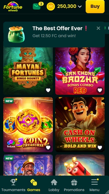 我们相信,玩家会像我们一样,欣赏 Fortune Wheelz Casino 社交游戏网站设计师对网站外观的精雕细琢。该赌场致力于为玩家提供极简主义的用户体验,将深绿色背景和黄色色调的迷人配色与直观的界面完美融合,即使是新手也能轻松上手。