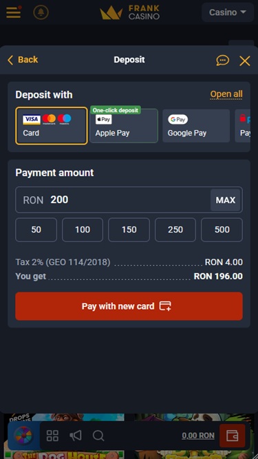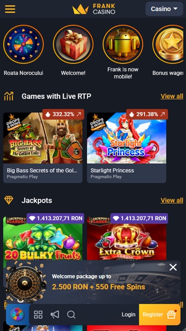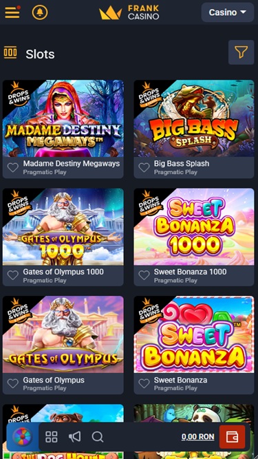 Frank Casino 由 Microgaming, Net Entertainment, Playtech, BetSoft, 1x2gaming, Amatic Industries, Big Time Gaming, ELK Studios, Evolution Gaming, EYECON, Ezugi, Genesis Gaming, Habanero Systems, iSoftBet, lightningboxgames, Novomatic, Oryx, Play'n GO, playson, Quickspin, Rabcat, Relax Gaming, Rival, Thunderkick, Yggdrasil, Endorphina, Wazdan, Realistic Games, GameArt, Betgames, Booming Games, Stakelogic, Pragmatic Play, Nolimit City, Felt Gaming, Red Tiger Gaming, Booongo, Spinomenal, Red Rake Gaming, Skillzzgaming, Fugaso, Belatra Games, Fantasma Games, SYNOT Games, Kalamba, Revolver Gaming, Spin Games, Skywind, Triple Edge Studios, Northern Lights Gaming, Fazi, Evoplay, Stormcraft Studios, Switch Studios, SA Gaming, Electric Elephant Games, Pocket Games Soft, Bulletproof Games, All41 Studios, Gluck Games, Mascot Gaming, Gameburger Studios, Pulse 8 Studios, Neon Valley Studios, Golden Rock Studios, Swintt, TrueLab Games, SpinPlay Games, SmartSoft Gaming, Real Dealer Studios, Blue Guru Games, On Air Entertainment, Buck Stakes Entertainment, Games Global, Amusnet Interactive, 2by2 Gaming, Ainsworth, Ash Gaming, bluberi, Blueprint Gaming, CT Interactive, Greentube, Push Gaming, Tom Horn Gaming, Inspired Gaming, Gamomat, Reel Time Gaming, Authentic Gaming, BF Games, betiXon, Iron Dog Studio, Old Skool Studios, Foxium, Just For The Win, Reflex Gaming, Storm Gaming Technology, Bla Bla Bla Studios, PearFiction Studios, Apollo Games, Wild Streak Gaming, Slingshot Studios, Golden Hero, Fortune Factory Studios, STHLM Gaming, RubyPlay, 4ThePlayer, AvatarUX, Gamevy, Crazy Tooth Studio, NetGaming, ReelPlay, Japan Technicals Games, Zonelock, Alchemy Gaming, Rarestone Gaming, Black Pudding Games, Snowborn Games, Boomerang Studios, Hacksaw Gaming, Max Win Gaming, Gold Coin Studios, Bang Bang Games, Gamzix, Half Pixel Studios, Arcadem, Slotmill, SilverBack Gaming, Peter And Sons, Aurum Signature Studios, Lucksome Gaming, Area Vegas, ELA Games, Leap Gaming, 3 Oaks Gaming, Wishbone Games, Spribe, Circular Arrow, Print Studios, Gaming Corps, HammerTime Games, Four Leaf Gaming, INO Games, Nailed It! Games, Atomic Slot Lab, Neko Games, Reel Kingdom, Oros Gaming, Givme Games, Indigo Magic, VoltEnt and Boldplay提供支持,其游戏通过即时游戏的网页平台提供,可直接通过您的网页浏览器加载。该赌场还全面支持移动端游戏,这意味着您可以通过智能手机或平板电脑畅玩 Frank Casino 的游戏。