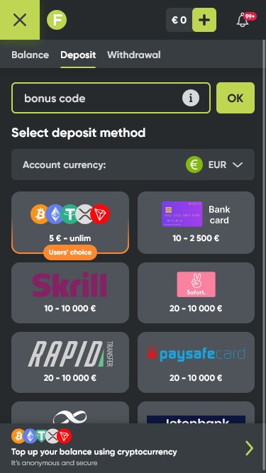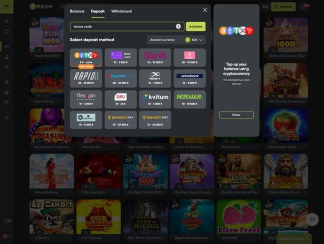 Fresh Casino 提供可靠、安全和流行的银行业务选项,包括支付卡、电子钱包、移动交易和各种加密货币支付方式。